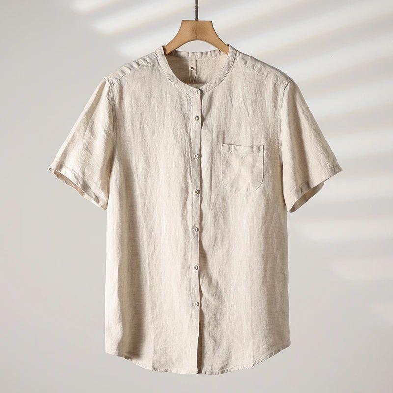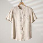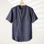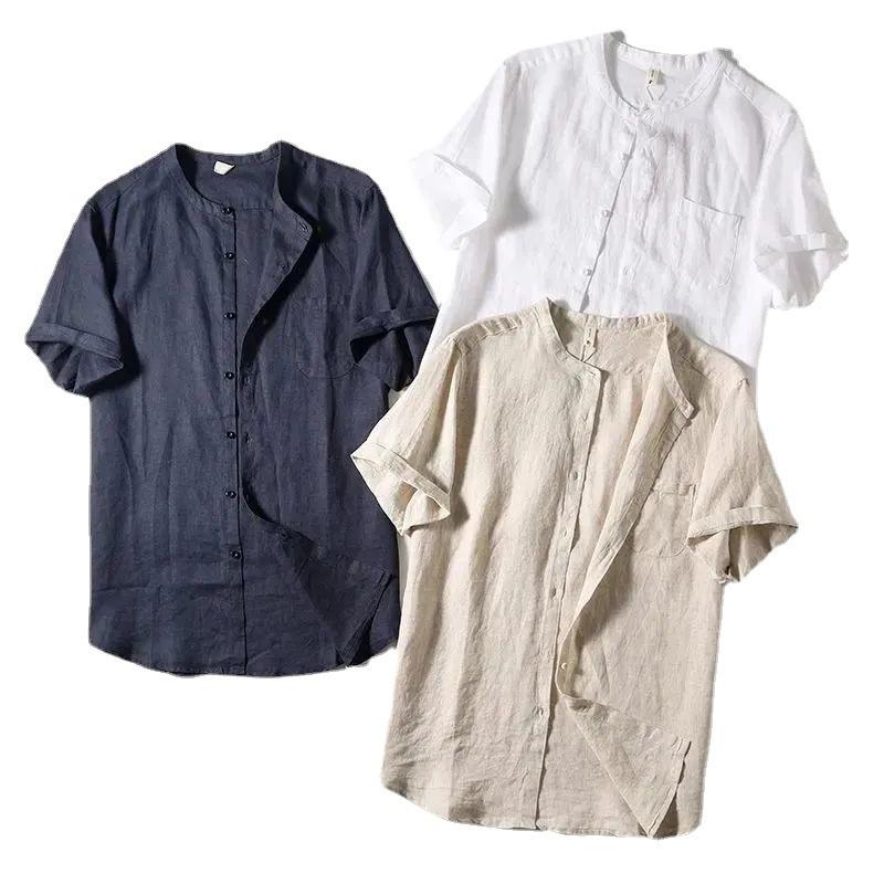 Linen fabric is light and breathable, men’s literary and casual, loose thin stand-up collar, linen short-sleeved shirt, cool men’s wear