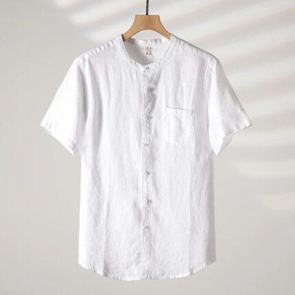 Linen fabric is light and breathable, men’s literary and casual, loose thin stand-up collar, linen short-sleeved shirt, cool men’s wear